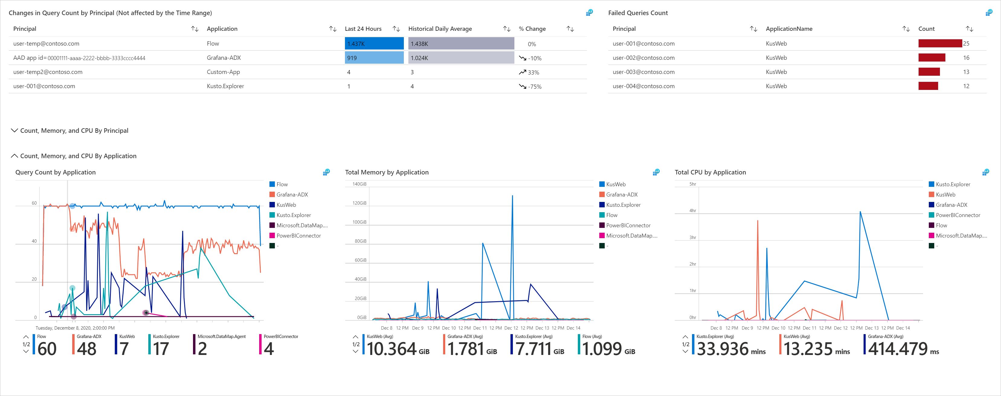 • Identify trends and peaks in the number of queries, memory, and CPU consumption by workload group, user, application, and command type.