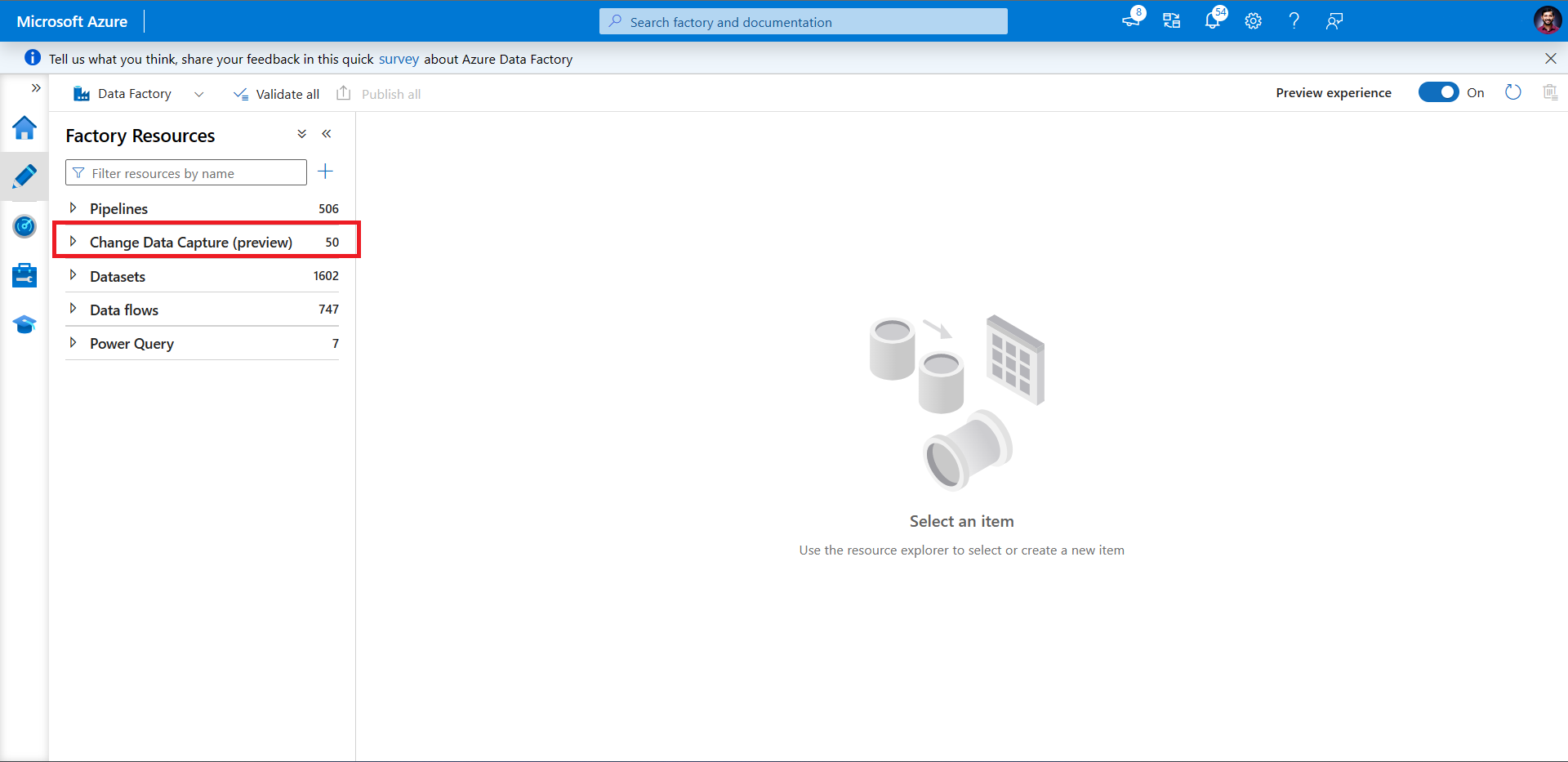 Go to the Author pane in your data factory. Below Pipelines, a new top-level artifact called Change Data Capture (preview) appears.