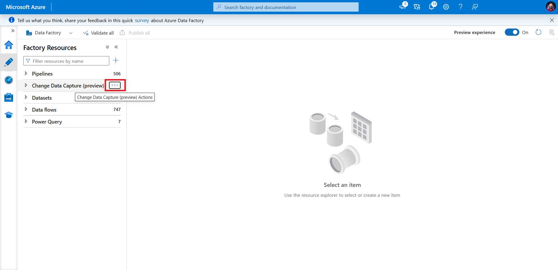 Hover over Change Data Capture (preview) until three dots appear. Then select Change Data Capture (preview) Actions.