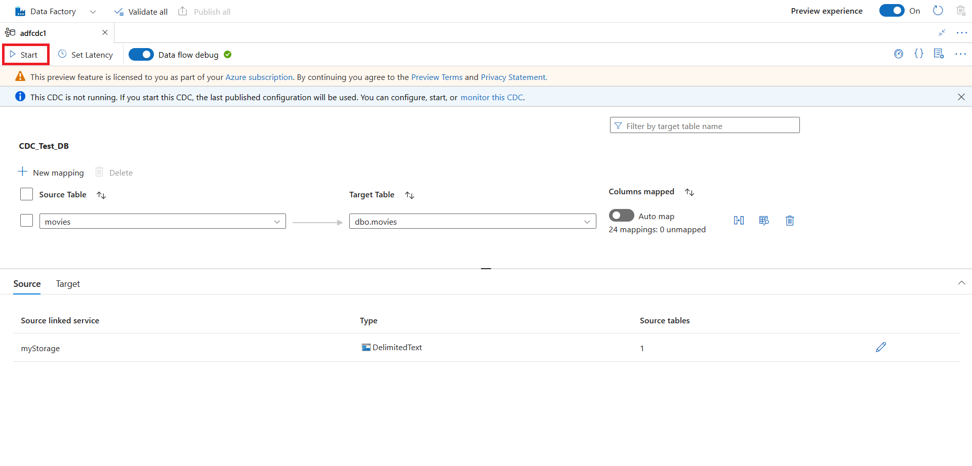 If you don't publish your changes, you won't be able to start your CDC resource. The Start button in the next step will be unavailable.