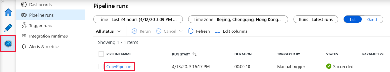 3. Go to the Monitor tab on the left. You see a pipeline run that is triggered by a manual trigger. You can use links under the PIPELINE NAME column to view activity details and to rerun the pipeline.