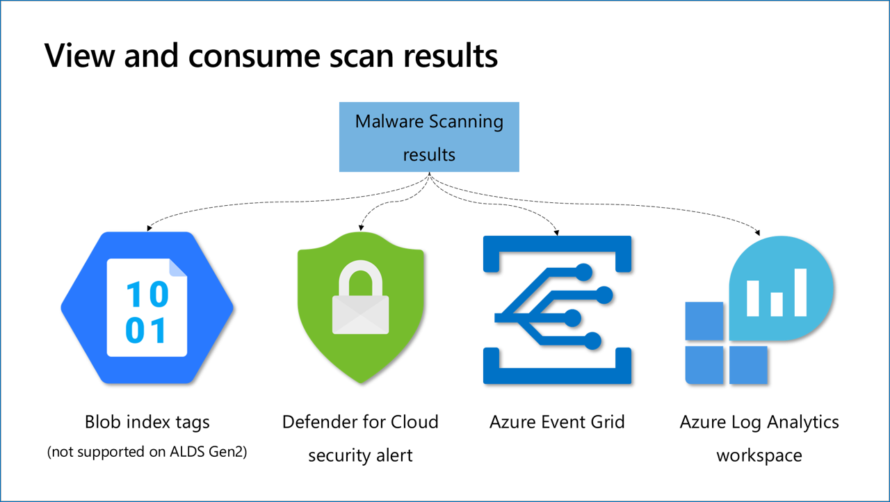 Malware scan results are available through four methods. After setup, you'll see scan results as blob index tags for every scanned file, and as Microsoft Defender for Cloud security alerts when a file is identified as malicious. You can choose to disable the use of blob index tags in the Azure portal or through the REST API. You can also configure additional scan result methods, such as Event Grid and Log Analytics, which require extra configuration. The next sections describe each scan result method in more detail.