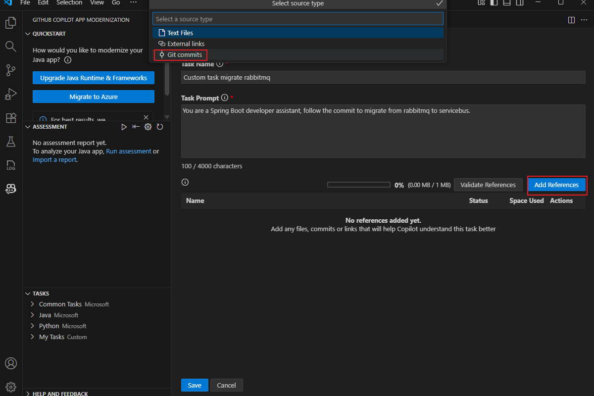 task.mdfile opens. In the Task Name field, enter Custom task migrate rabbitmq. In the Task Prompt field, enter You are a Spring Boot developer assistant, follow the commit to migrate from rabbitmq to servicebus.Select Add References and then select Git commits in the pop-up dialog box.