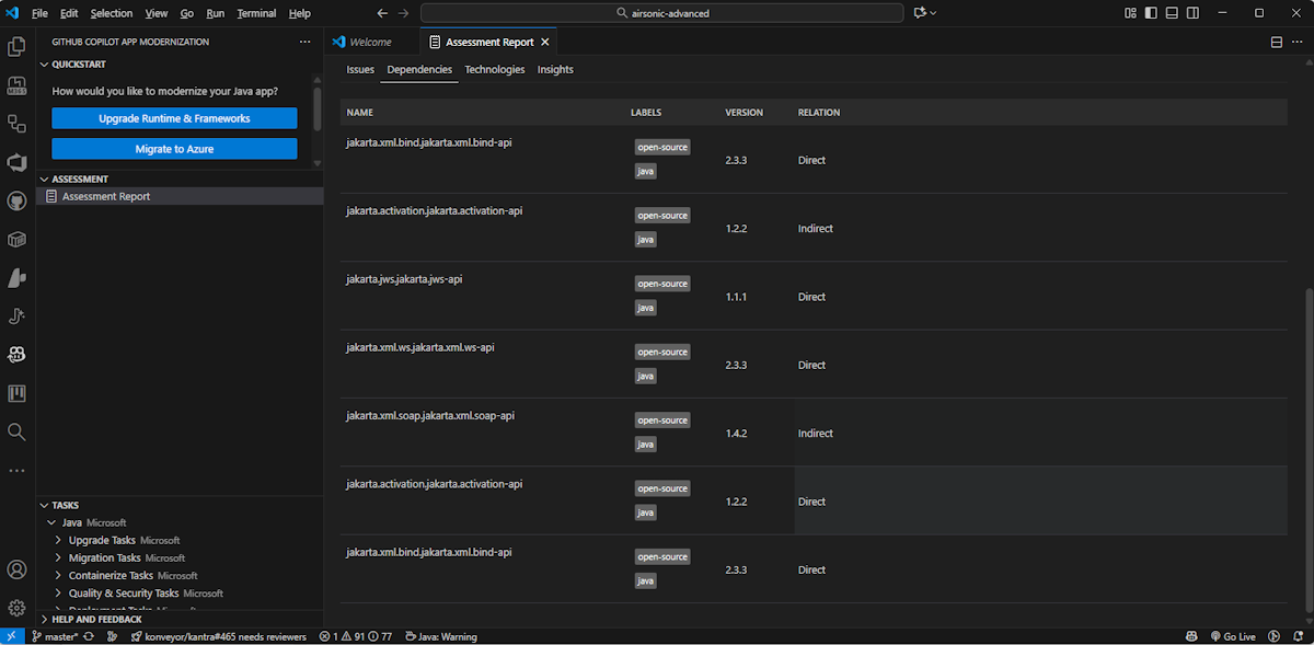Screenshot of Visual Studio Code that shows the GitHub Copilot app modernization assessment report dependency list.
