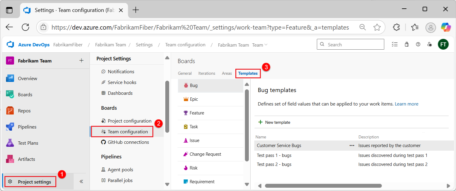 Select a work item type, such as Bug, Feature, or Test Case to view or add templates for that type: