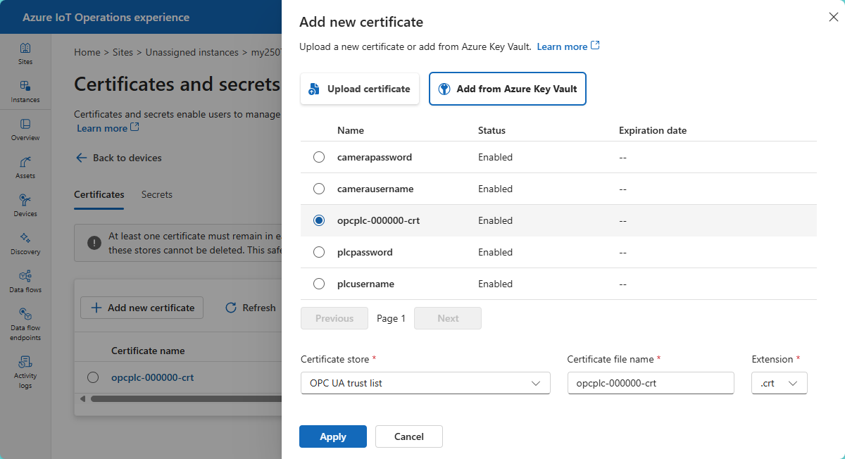 When you deploy Azure IoT Operations with secure settings, you can start adding certificates to Azure Key Vault, and sync them to the Kubernetes cluster to be used in the Trust list and Issuer list stores for external connections.