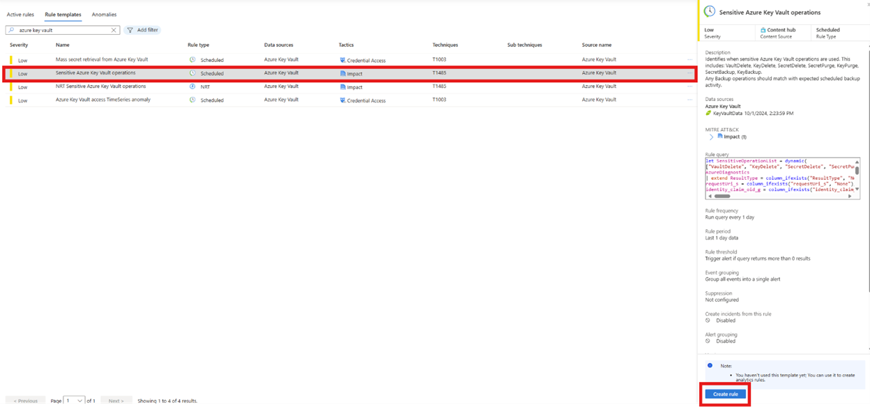 Use the rule template that matches your use case best. In this example, we select Sensitive Key Vault operations. In the sidebar that appears, select Create rule.