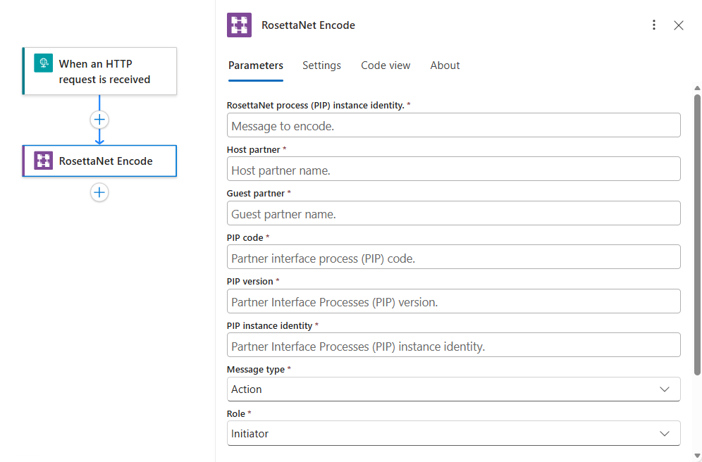 This guide provides a short overview about RosettaNet and shows how to add the encoding and decoding actions for RosettaNet to an existing logic app workflow. The RosettaNet connector doesn't provide any triggers, so you can use any trigger to start your workflow. The examples in this guide use the Request trigger.