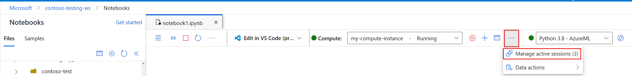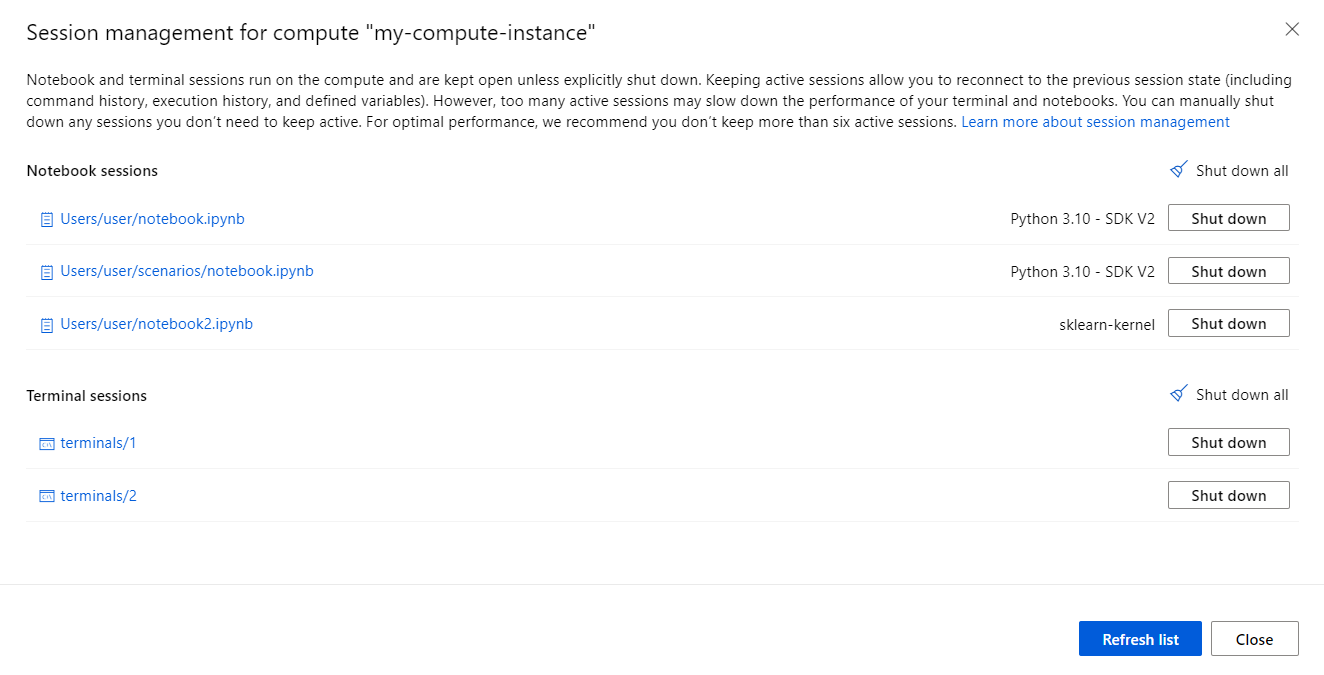 Use the session management panel in Azure Machine Learning studio to help you manage your active sessions and optimize the performance of your compute instance. Navigate to this session management panel from the compute toolbar of either a terminal tab or a notebook tab.
