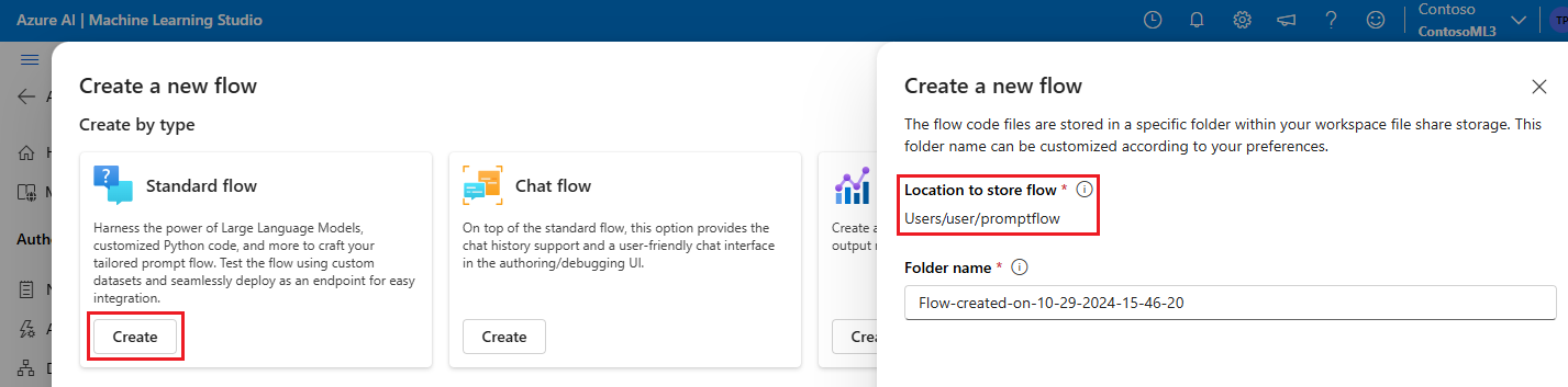 Azure Machine Learning provides a shared file system for all workspace users. Upon flow creation, a corresponding flow folder is automatically generated and stored in the Users/<username>/promptflow directory.