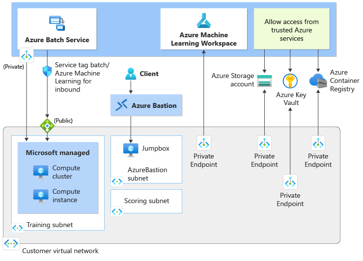 - An Azure Machine Learning workspace that uses a private endpoint to communicate using the virtual network.