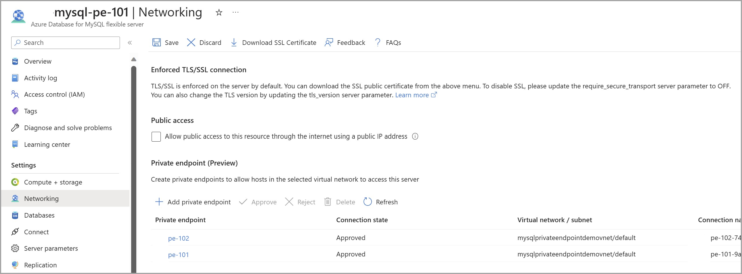 1. When creating an Quickstart: Create an instance of Azure Database for MySQL with the Azure portal in the Networking tab, choose Public access (allowed IP addresses) and Private endpoint as the connectivity method.