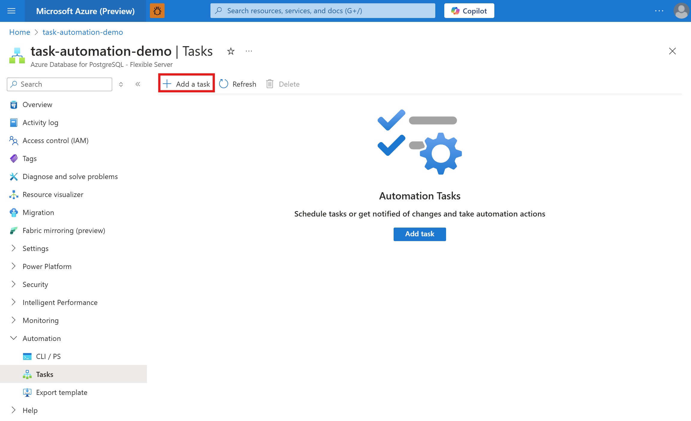 - On the resource navigation menu, in the Automation section, select Tasks.