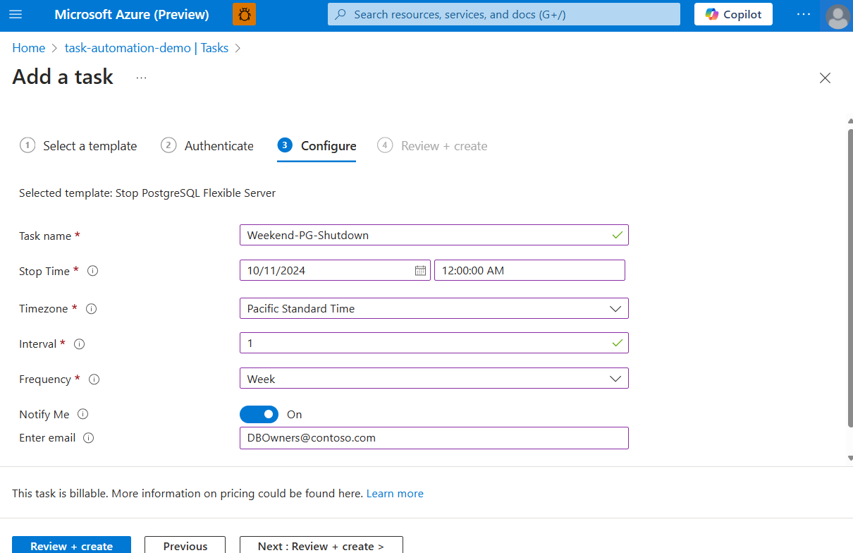 Under Configure, provide a name for the task and any other information required. When you're done, select Review + create.