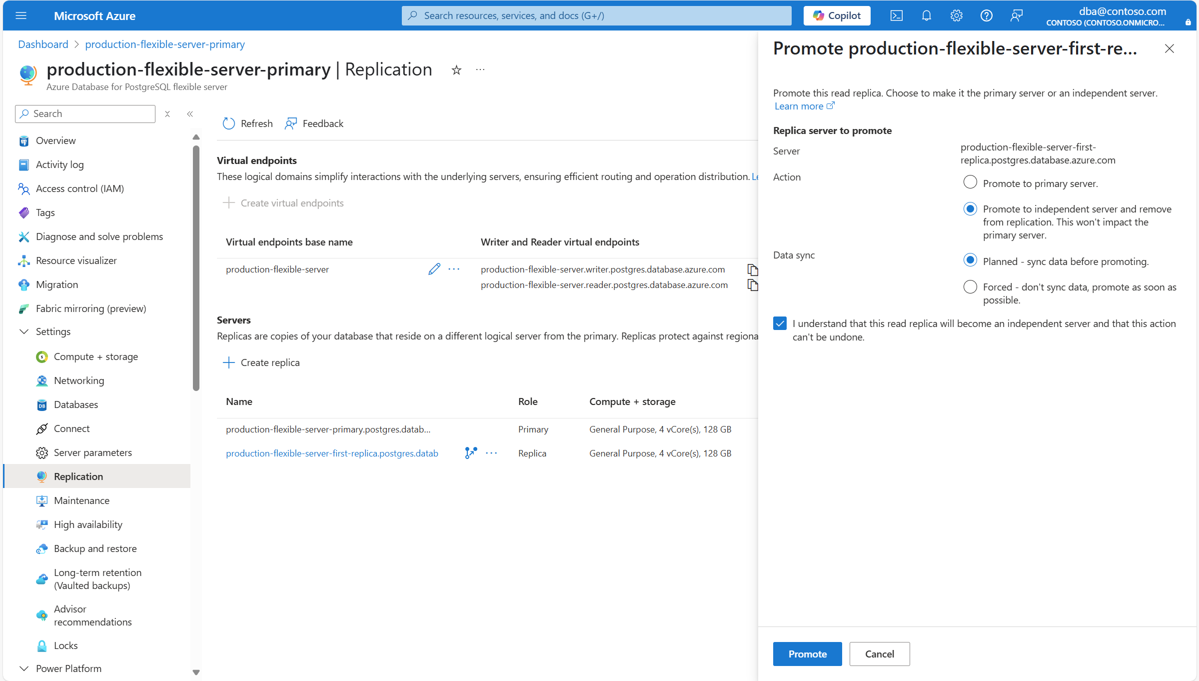 4. In Replica server to promote, select Promote to independent server and remove from replication. This won't impact the primary server. for Action. And select Planned or Forced for Data sync, depending on what suits your needs best. if you decide to use the Planned option, you have to mark the I understand that this read replica will become an independent server and that this action can't be undone. to acknowledge that the read replica will be detached into its own standalone entity. If you decide to use the Forced option, you have to mark the I understand that this read replica will become an independent server and that its data won't be synced first. This action can't be undone. checkbox to also acknowledge the potential data loss. Finally, select Promote.