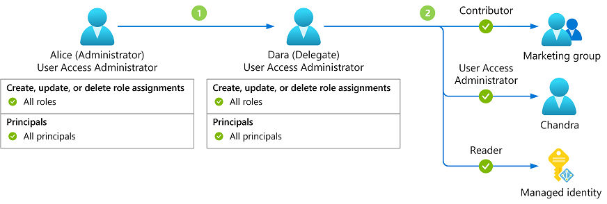 Consider an example where Alice is an administrator with the User Access Administrator role for a subscription. Alice wants to grant Dara the ability to assign specific roles for specific groups. Alice doesn't want Dara to have any other role assignment permissions. The following diagram shows how Alice can delegate role assignment responsibilities to Dara with conditions.