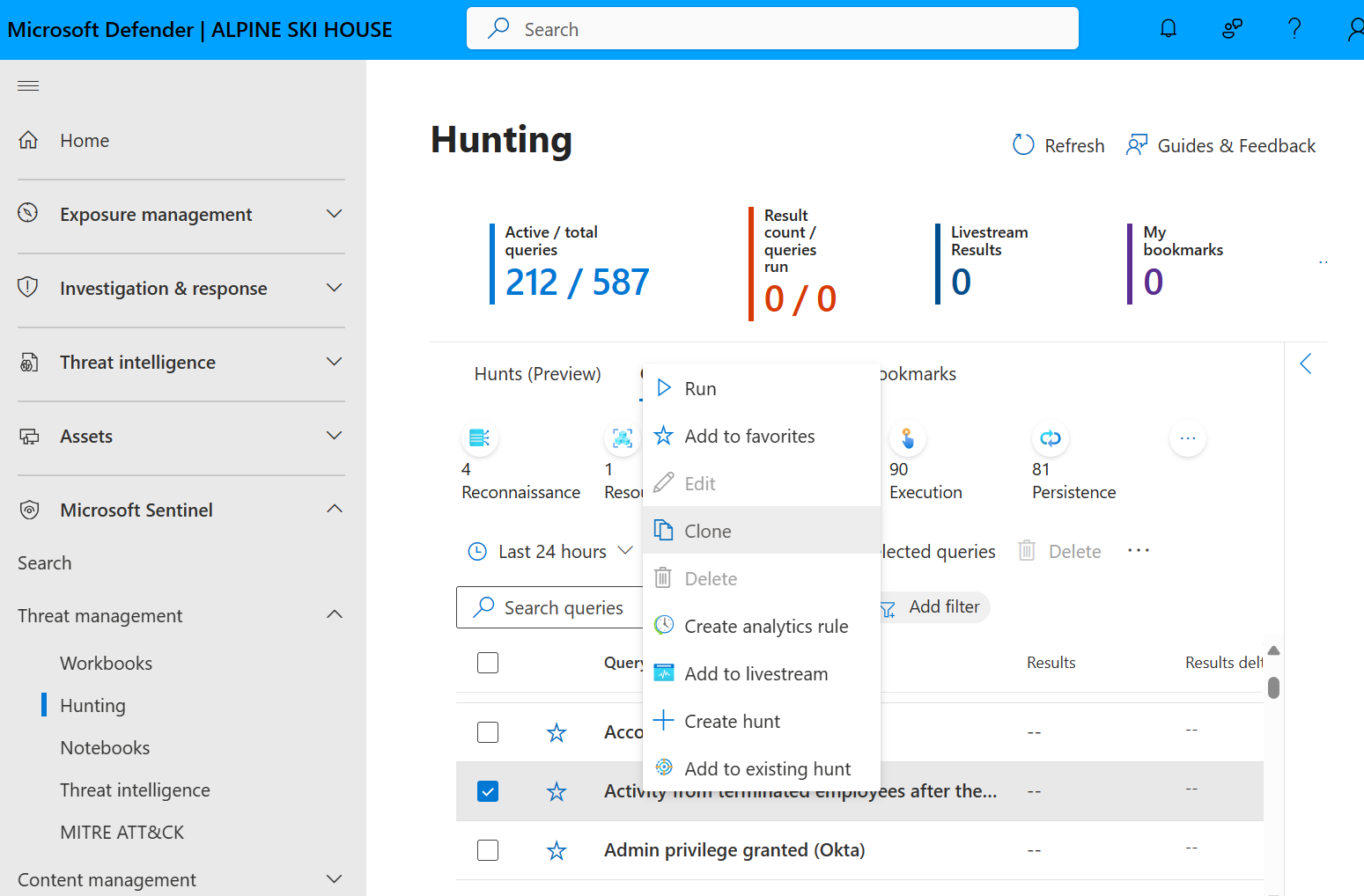 For Microsoft Sentinel in the Defender portal, select Microsoft Sentinel > Threat management > Hunting. For Microsoft Sentinel in the Azure portal, under Threat management select Hunting.