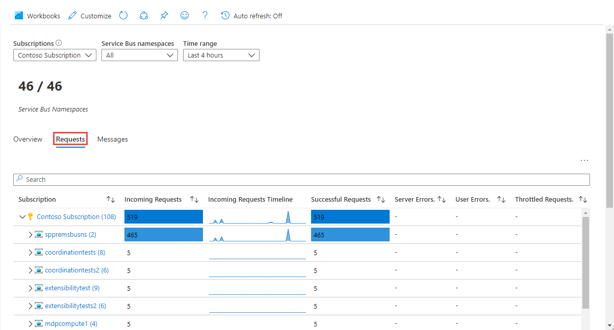 At scale perspective of your Service Bus resources across all your subscriptions in a single location, with the ability to selectively scope to only those subscriptions and resources you're interested in evaluating.