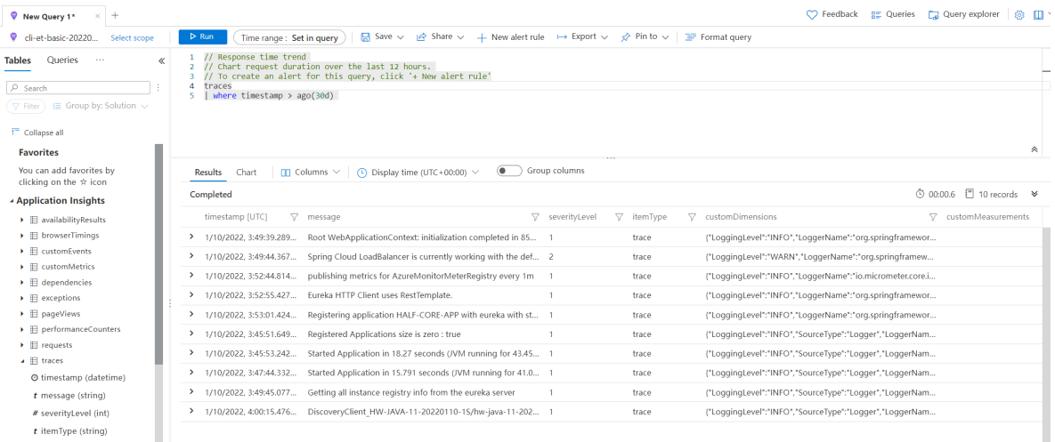 - You created an application around 8:00 AM today from Azure Spring Apps with the Java agent enabled, and then you deployed a JAR file to this application around 8:10 AM today. After some testing, you change the code and deploy a new JAR file to this application at 8:30 AM today. Then, you take a break, and when you come back around 11:00 AM, you check some data from Application Insights. You see: