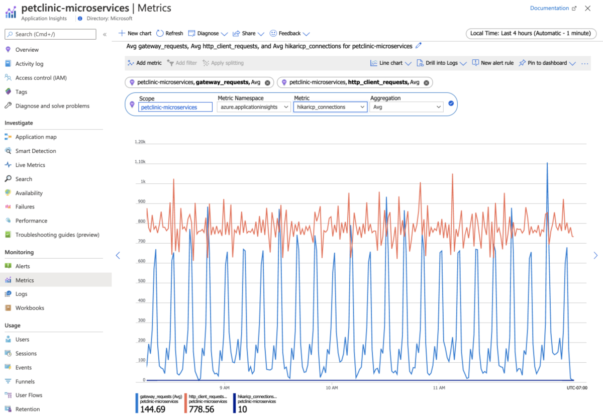 In the navigation pane, select Metrics and select the namespace to see both Spring Boot metrics and custom metrics, if any.