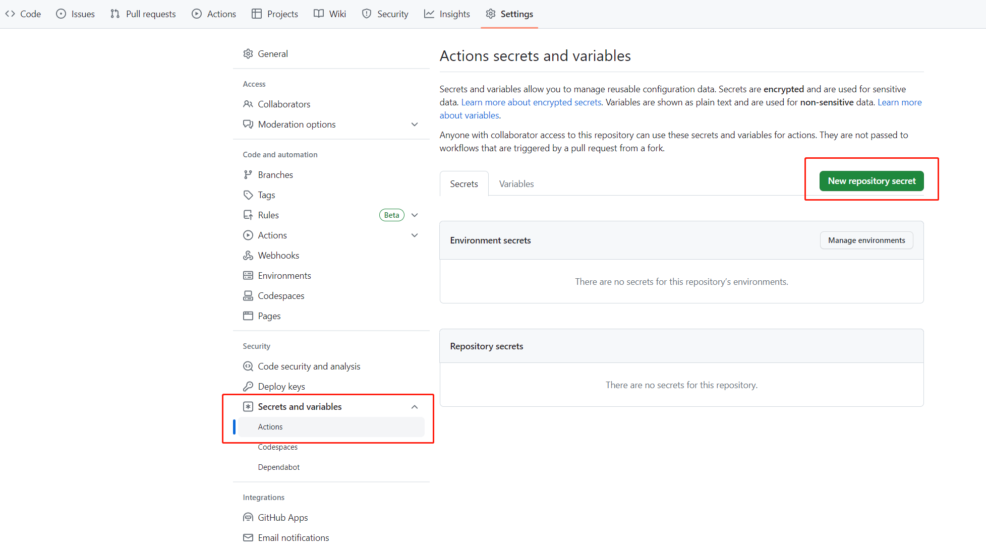 Screenshot of the GitHub Actions secrets and variables page with the New repository secret button highlighted.