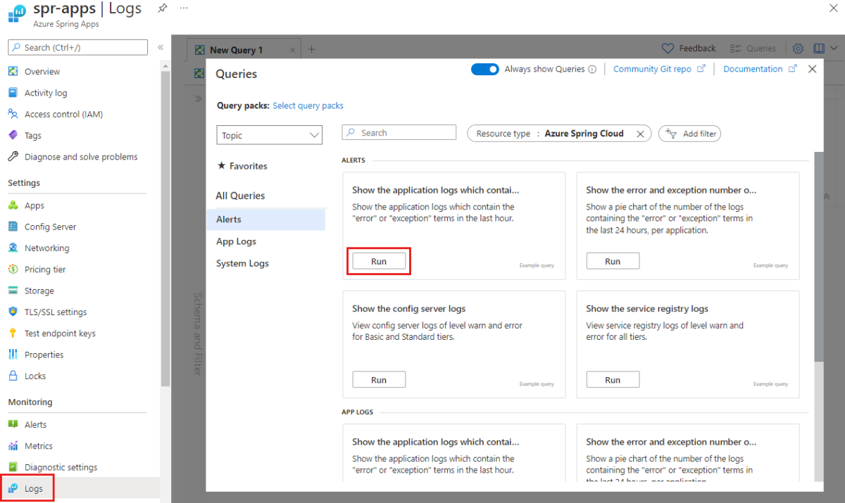 1. In the Azure portal, go to the service | Overview page and select Logs in the Monitoring section. Select Run on one of the sample queries for Azure Spring Apps.