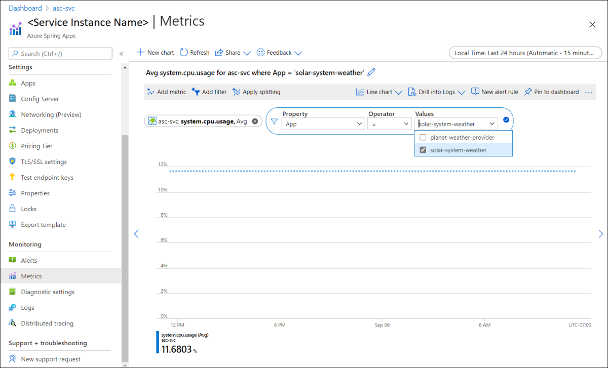 2. Select Add filter in the toolbar, select App=solar-system-weather to see CPU usage only for the solar-system-weather app.