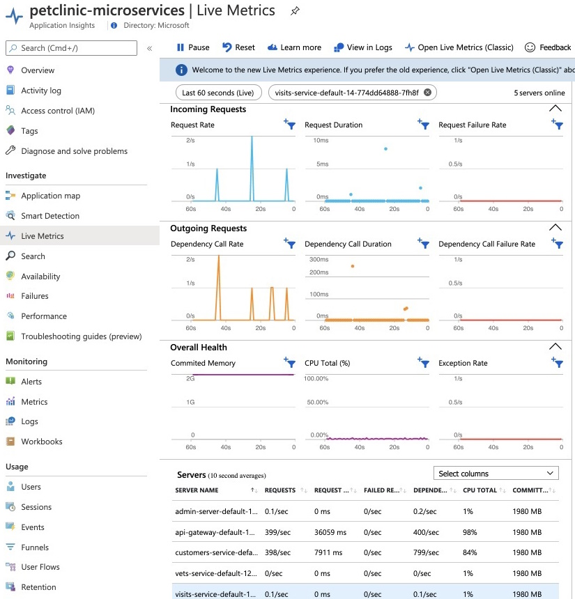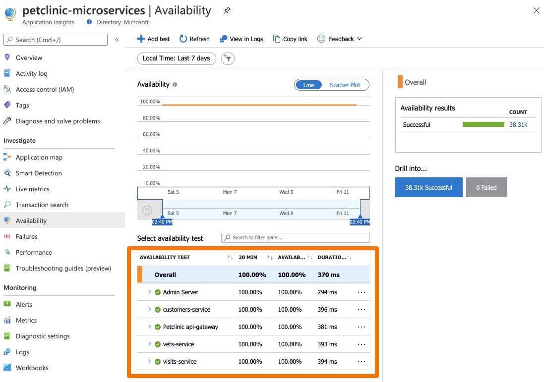 With the built-in monitoring capability in Azure Spring Apps, you can debug and monitor complex issues. Azure Spring Apps integrates Spring Cloud Sleuth with Azure's Application Insights. This integration provides powerful logs, metrics, and distributed tracing capability from the Azure portal. The following procedures explain how to use Log Streaming, Log Analytics, Metrics, and Distributed tracing with deployed PetClinic apps.