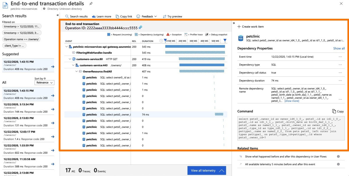 Screenshot of the Azure portal that shows the End-to-end transaction details page.
