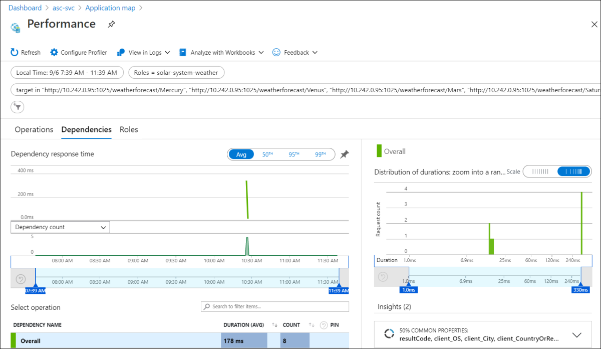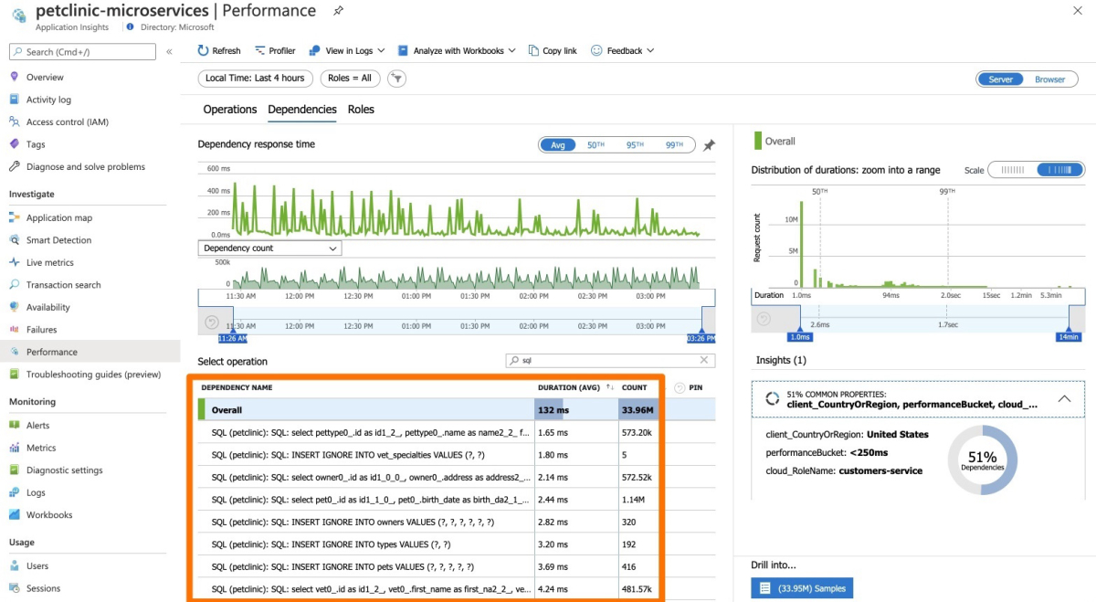 Navigate to the Dependencies tab, where you can see the performance number for dependencies, particularly SQL calls: