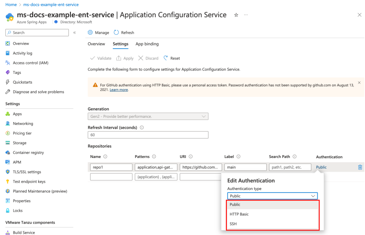 The following screenshot shows the three types of repository authentication supported by Application Configuration Service: