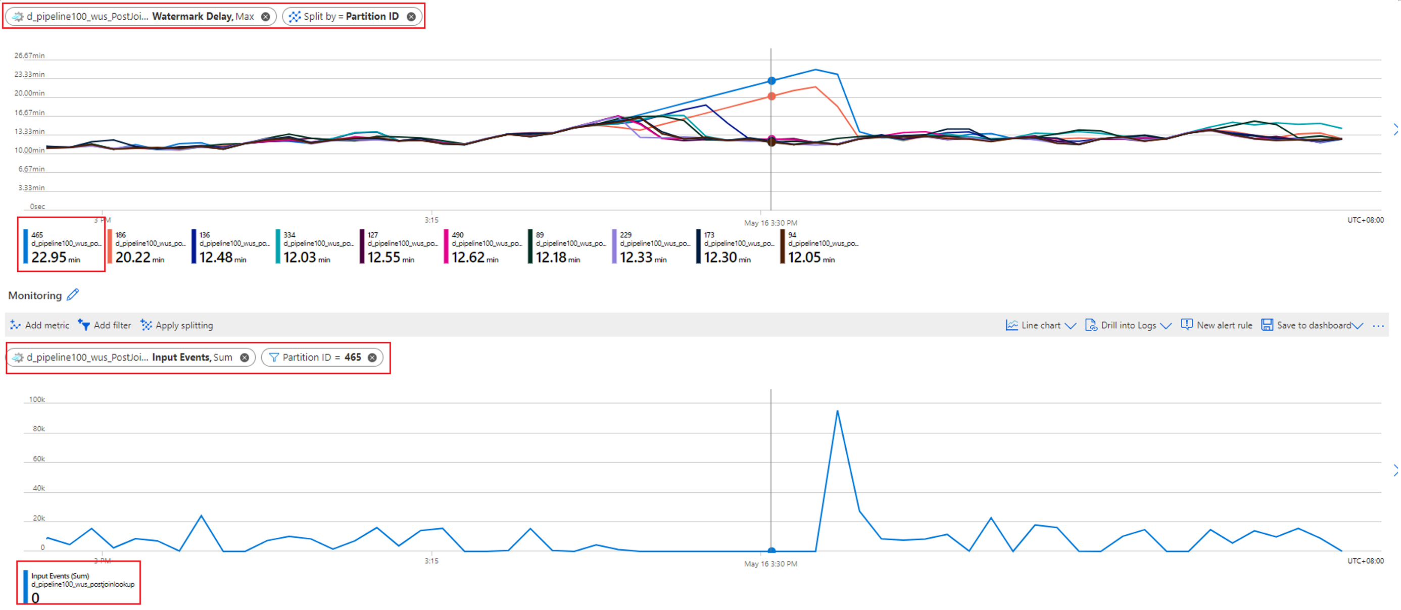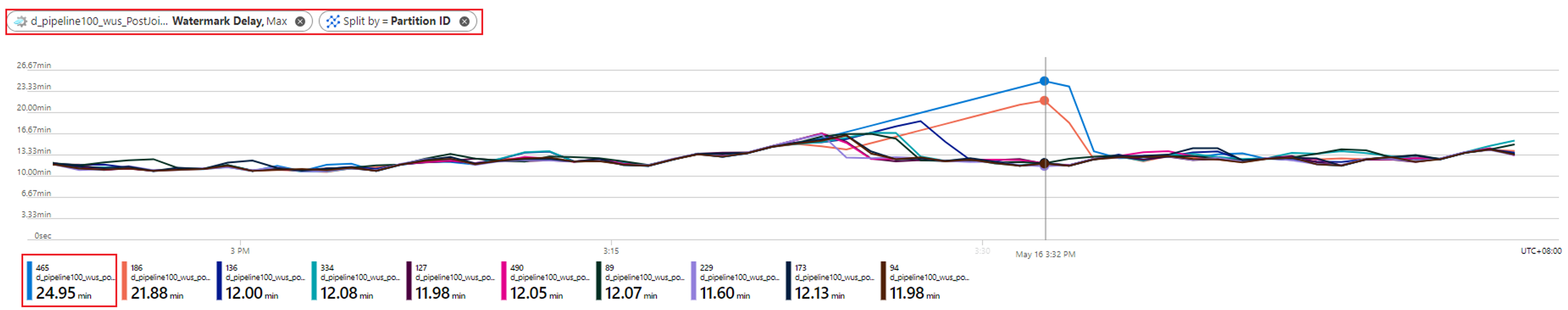 1. Check which partition has the increasing watermark delay. Select the Watermark Delay metric and split it by the Partition ID dimension. In the following example, partition 465 has a high watermark delay.