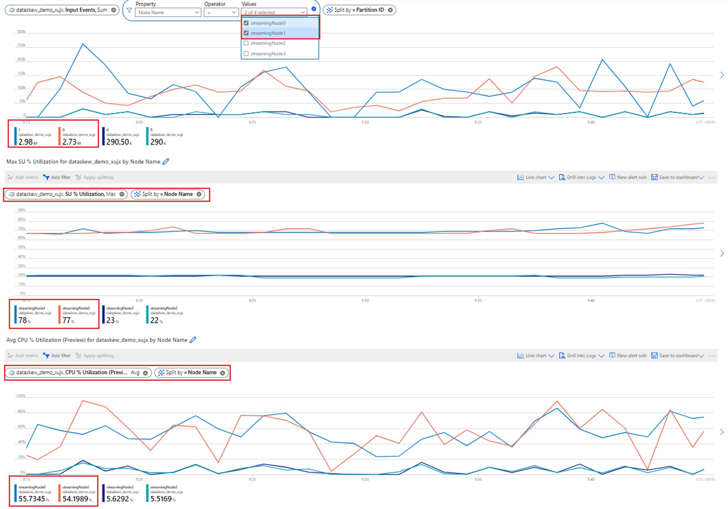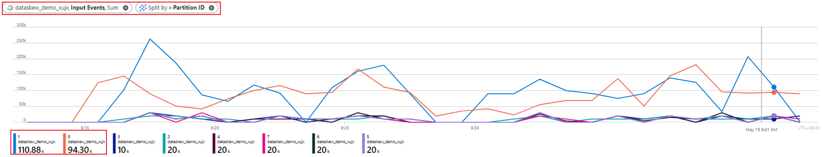 2. Split the Input Events metric by Partition ID to confirm if there's data skew in input data for each partition.