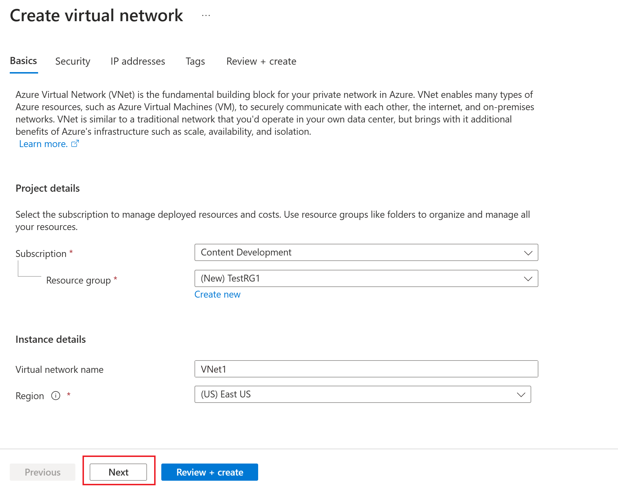 In this section, create VNet1 using the following values. If you're using your own values, make sure the address spaces don't overlap with any of the virtual networks to which you want to connect.