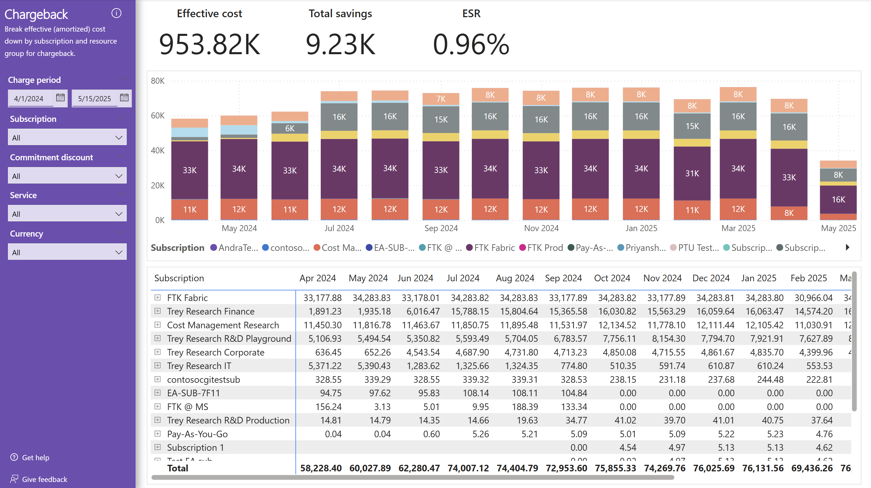 The Chargeback page helps facilitate chargeback at a subscription or resource group level. The chart shows effective (amortized) cost over time for each subscription while the table shows a hierarchical breakdown of costs by subscription and resource group.