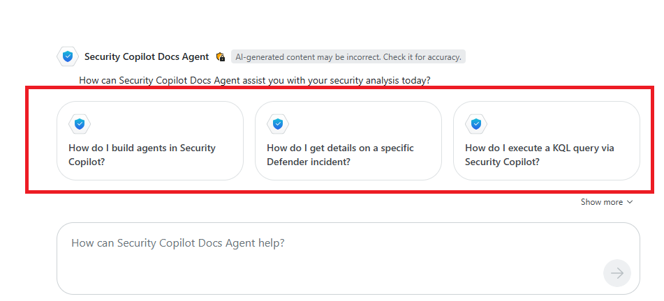 Users can explore the agent’s capabilities, get contextual next steps, and resolve issues directly in Security Copilot.