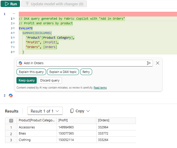 I can conversationally make updates to my initial request. Type in "Add in Orders" and hit enter and Copilot adds in the additional measure. I can again run the query to see the results.