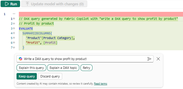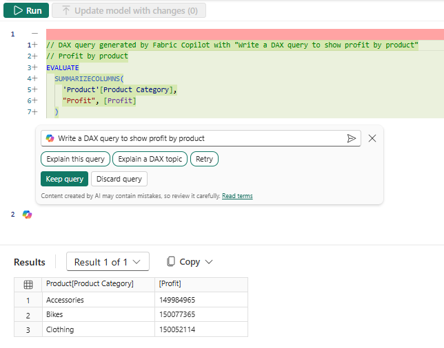 To use Copilot to create a DAX query, type in a prompt to describe what DAX query you would like generated and select Send or press Enter. Alternatively, you can click the Write DAX query inspire button. To run what is returned, select Run or press F5 to see the results of the DAX query. To keep the query and exit Copilot, select Keep query to add it to query tab.