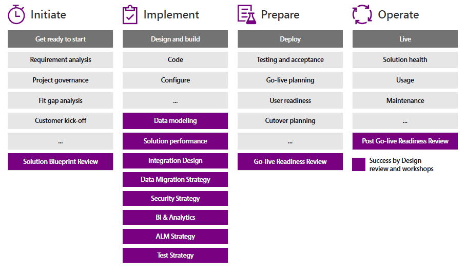 Success by Design maps the Dynamic 365 implementation lifecycle into five methodology-agnostic phases: Discover, Initiate, Implement, Prepare, and Operate. In this section and the following sections, we outline the Success by Design phases, their relationship to Success by Design reviews, and the desired outputs and outcomes.