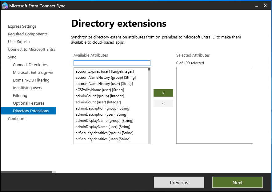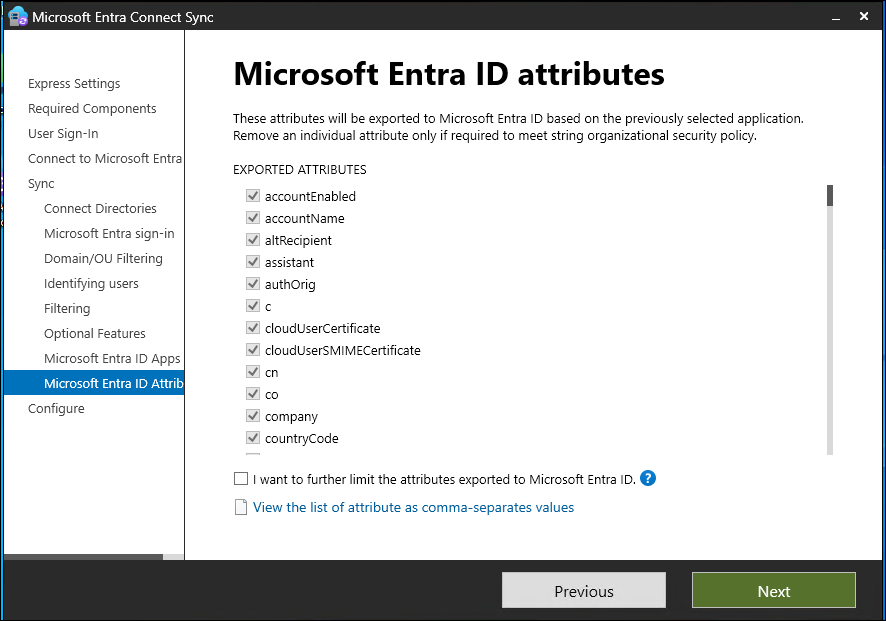 Choose a specific attribute This option allows you to select your own attribute. If you choose this option, user objects whose (selected) attribute is unpopulated aren't synchronized to Microsoft Entra ID. Limitation: Only attributes that are already in the metaverse are available for this option.