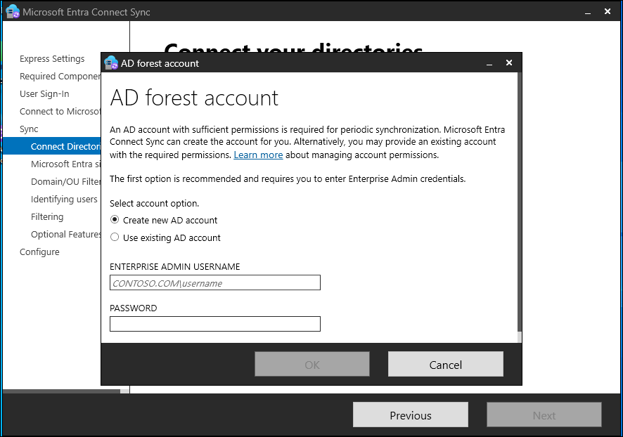 Create new account Create the AD DS account that Microsoft Entra Connect needs to connect to the Active Directory forest during directory synchronization. After you select this option, enter the username and password for an enterprise admin account. Microsoft Entra Connect uses the provided enterprise admin account to create the required AD DS account. You can enter the domain part in either NetBIOS format or FQDN format. That is, enter FABRIKAM\administrator or fabrikam.com\administrator.