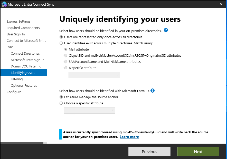 Let Azure manage the source anchor Select this option if you want Microsoft Entra ID to pick the attribute for you. If you select this option, Microsoft Entra Connect applies the sourceAnchor attribute selection logic that's described in Using ms-DS-ConsistencyGuid as sourceAnchor. After the custom installation finishes, you see which attribute was picked as the sourceAnchor attribute.