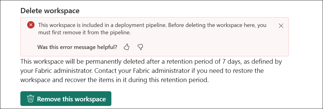 If you attempt to delete a workspace via the workspace settings, and that workspace is currently assigned to a Deployment Pipeline, the deletion fails.