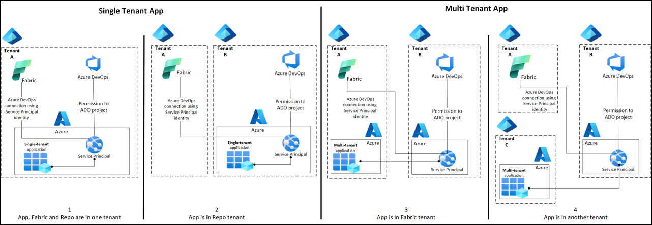 | 4 - Fabric, DevOps, and application all reside in different tenants | Accounts in any organizational directory - multitenant apps | Create SP in Azure DevOps tenant. See examples. |
