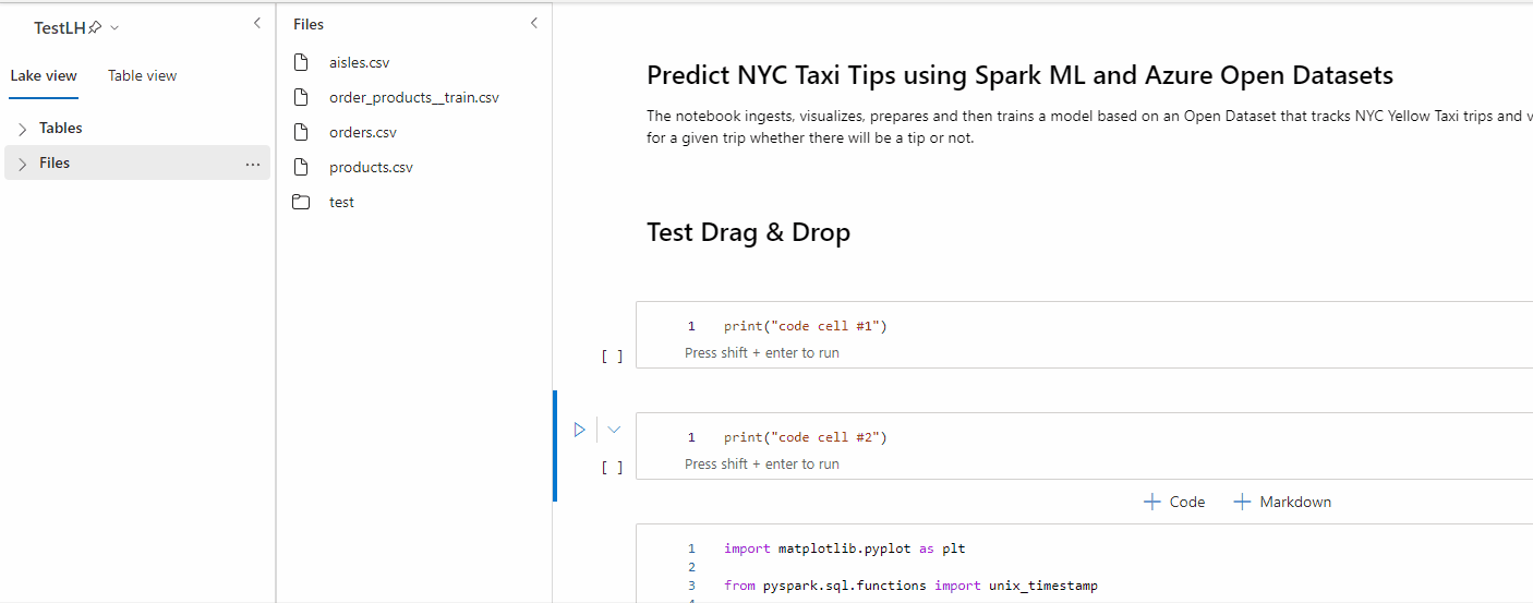 Use drag and drop to read data from Lakehouse explorer conveniently. Multiple file types are supported here; you can operate on text files, tables, images, etc. You can either drop to an existing cell or to a new cell. The notebook generates the code snippet accordingly to preview the data.