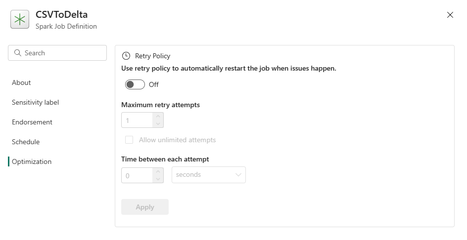 Optimization: On the Optimization tab, you can enable and set up the Retry Policy for the job. When enabled, the job is retried if it fails. You can also set the maximum number of retries and the interval between retries. For each retry attempt, the job is restarted. Make sure the job is idempotent.