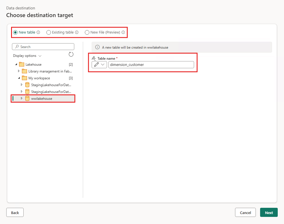 If the dimension_customer table doesn't exist, select the New table setting and enter the table name dimension_customer. If the table already exists, select the Existing table setting and choose dimension_customer from the list of tables in the object explorer. Select Next.