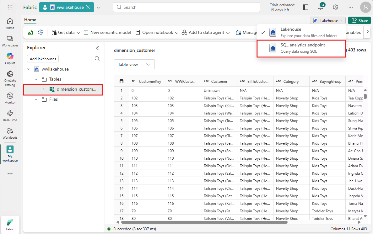 Select the table to preview its data. You can also use the SQL analytics endpoint of the lakehouse to query the data with SQL statements. Select SQL analytics endpoint from the Lakehouse dropdown menu at the top right of the screen.