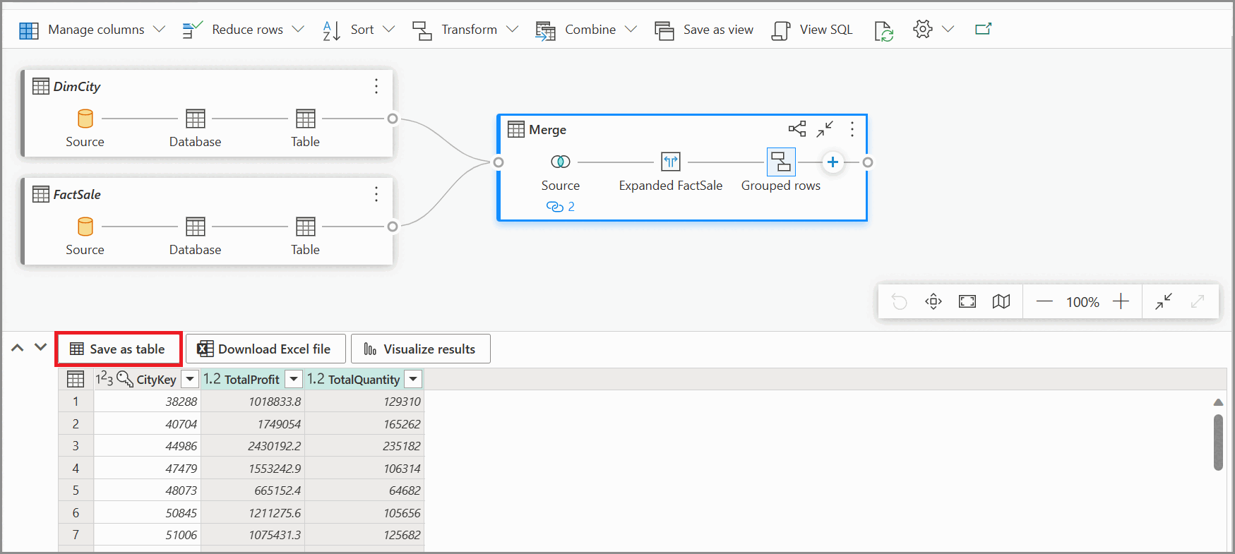 2. Then, the table FactSale is dragged from the Explorer into the visual query editor.