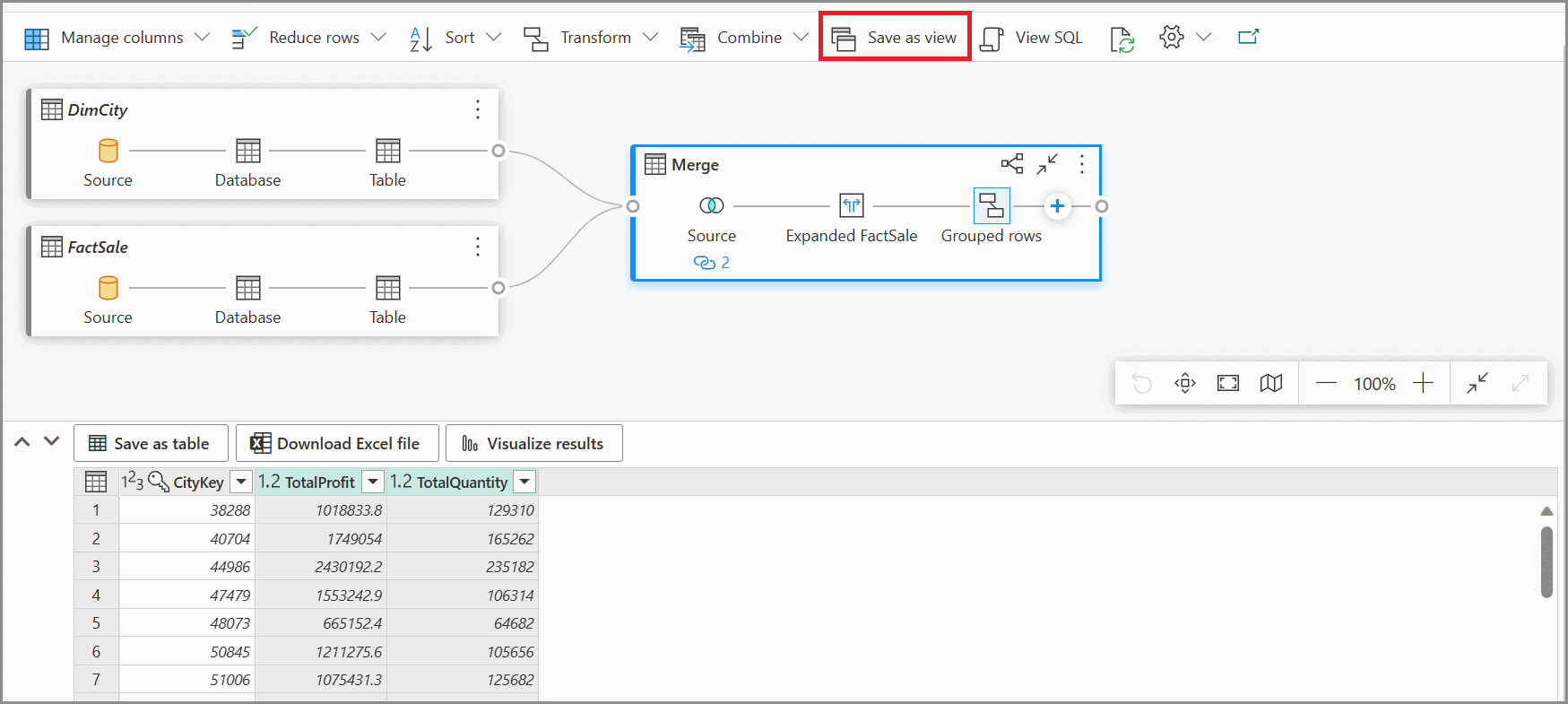 Select View query to see the resulting T-SQL, and Edit SQL script to edit the SQL query in the query editor.